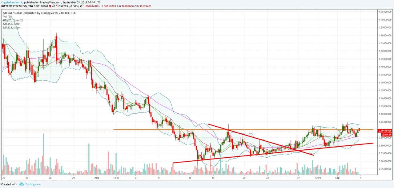The STEEM is still trying to break it's resistance zone at 1$. We really need a break out to break this line and take some distance from it. Till now this line is sometimes broken but the line is acting like a magnet and we are immediatly attracted by the line to go back under it. A break out will allow us to take some distance from it and we wll be able to move more freely without that magnet so close of us.