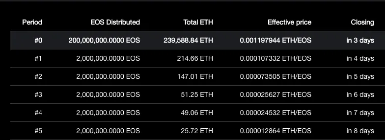 The first window (actually called period zero) lasts 5 days and is selling off the first 200 million EOS.