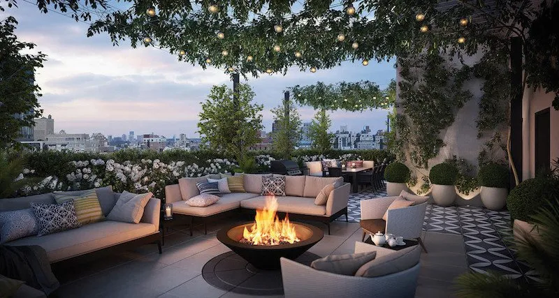 She gets up, walks to the picture window and looks out—gazes across the penthouse terrace at the New York skyline and the red sun dying in the west.