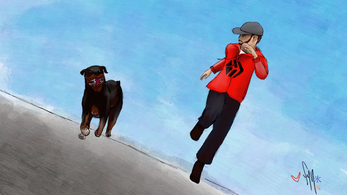 More recently I've been a lot more comfortable drawing people as characters (the terror of the person not liking the result is constant though) and inspired by one of his posts that included getting surprised by a dog on a run:
