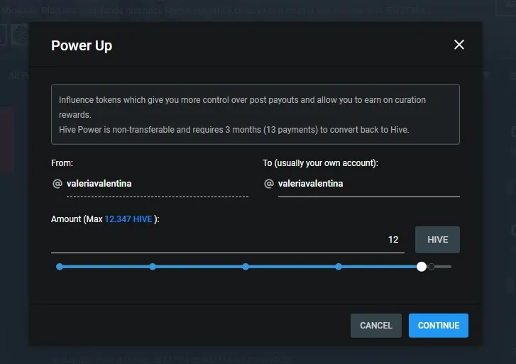 Power Up is equivalent to staking, it is basically converting the cryptocurrency available in the wallet into Hive Power, which helps to increase the influence and voting power on the platform. Doing Power Up on the first of each month and in general, brings various benefits for the user who performs it, at the same time, the community that makes life on the platform is also rewarded, since as I mentioned before, by increasing your HP, you increase your voting power, thus managing to give quality votes and support more users in general.