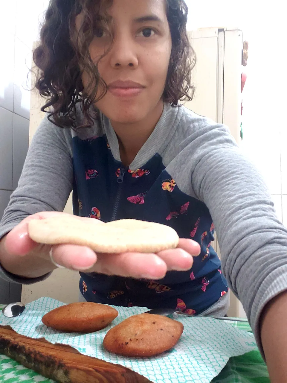 I heated enough oil, at medium-high heat, while I was shaping my first arepita. First make a small sphere of dough and then flatten it with your hands. They are thrown into the frying pan when the oil is very hot.