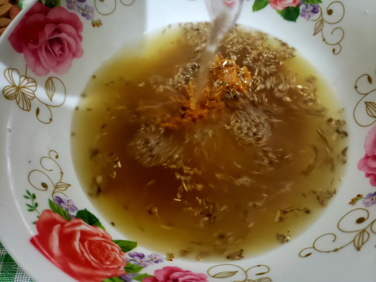 With the papelón or piloncillo in a bowl I added the anise seeds, the pinch of salt and the warm water, stirred and let stand for about 5 minutes until the piloncillo was completely dissolved.