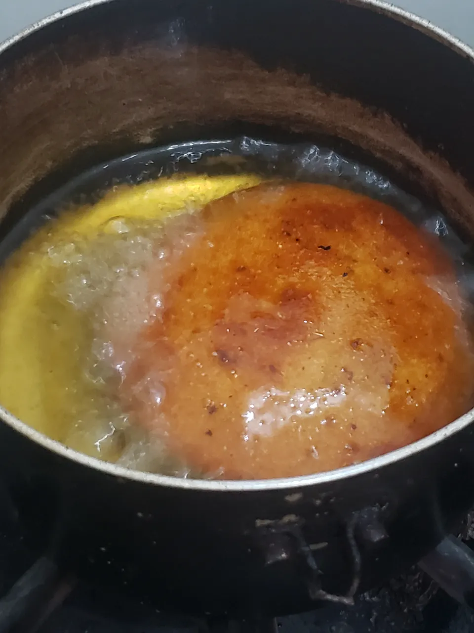 Es importante que las arepitas queden muy delgadas, como de 3 milímetro de espesor, y que queden totalmente sumergidas en el aceite, para que se inflen. Yo las freí una por una, ya que usé un pequeño caldero.