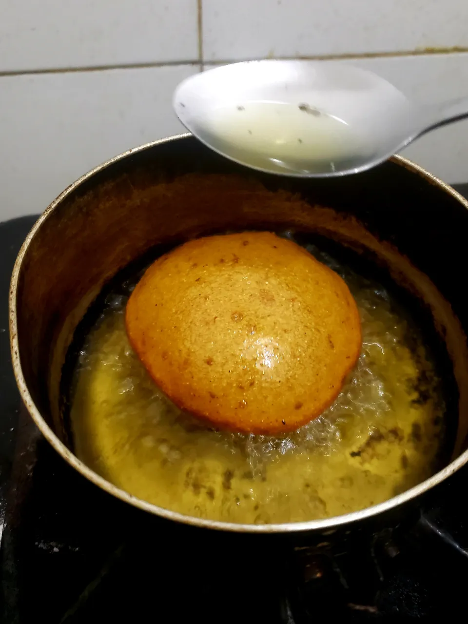 Yo no les di da vuelta, solo las bañé con el mismo aceite cuando la parte inflada brotó a la superficie, con la ayuda de una cuchara hasta que se doraron.
