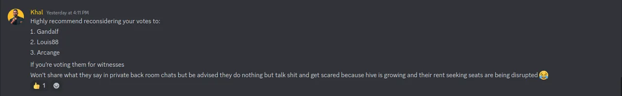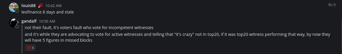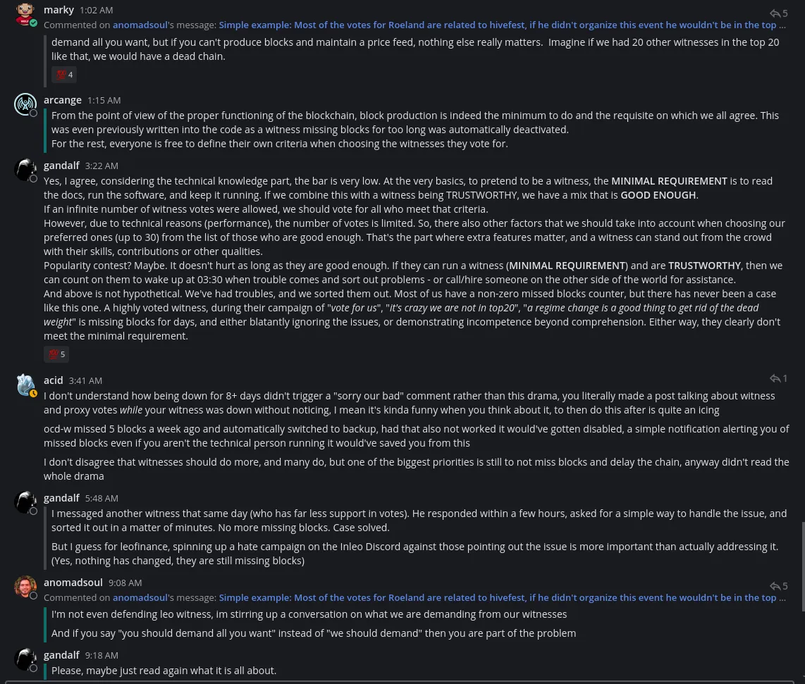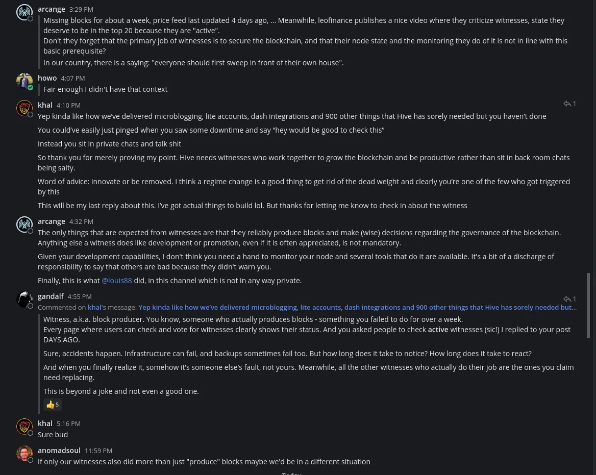 At this point, I have seen others mentioning a "discussion about witnesses going on in Mattersmost". A statement is also made in the LeoFinance discord to reconsider voting for @gandalf, @louis88, @arcange. Why I wonder? I already know I've been on this list for a while as I have heard about it quite a few times. I have no illusion of being popular.
