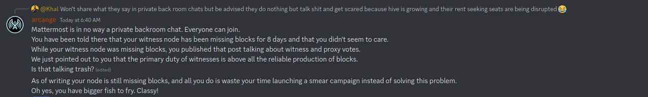 @arcange is right here, this discussion is actually available to everyone without even being invited to Mattersmost, the #witness channel is mirrored to https://openhive.chat/ where everyone on Hive is free to join. It is no longer the "secret slack" Ned ran.