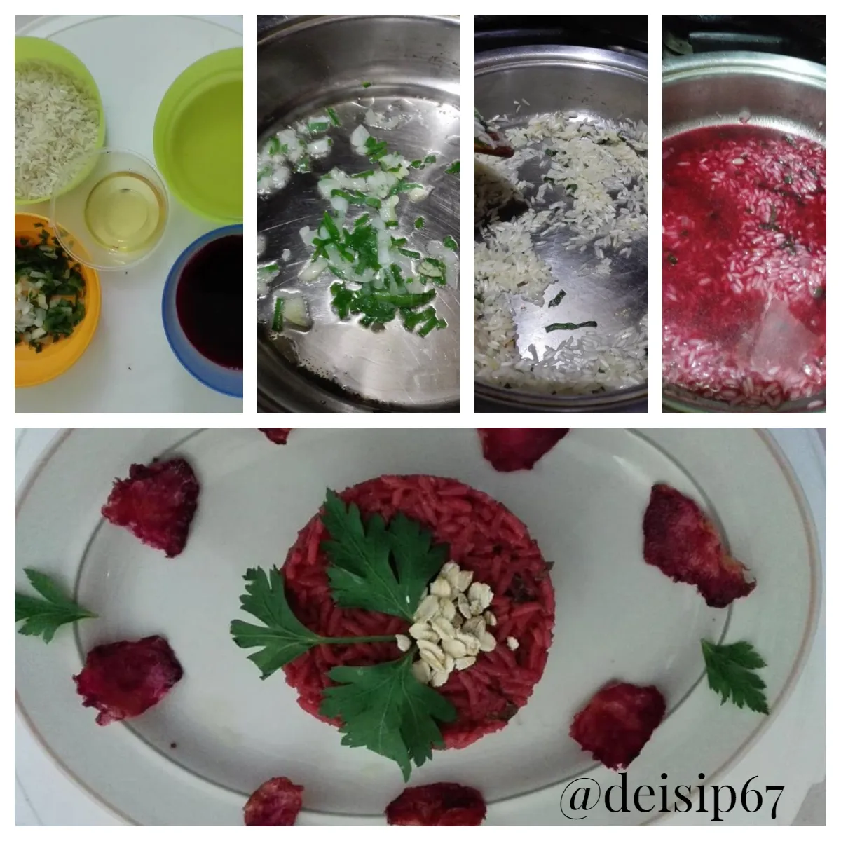 Beet risotto and vegetable broth and dessert, beet biscuits with cocoa and a 4 in 1 juice.