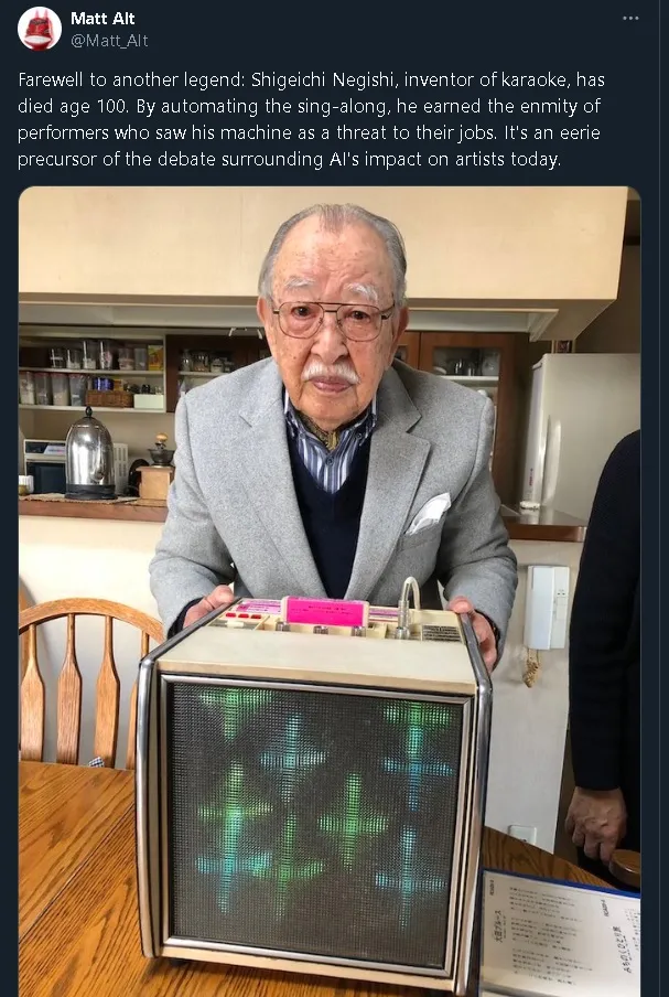 Farewell to another legend: Shigeichi Negishi, inventor of karaoke, has died age 100. By automating the sing-along, he earned the enmity of performers who saw his machine as a threat to their jobs. It's an eerie precursor of the debate surrounding AI's impact on artists today.