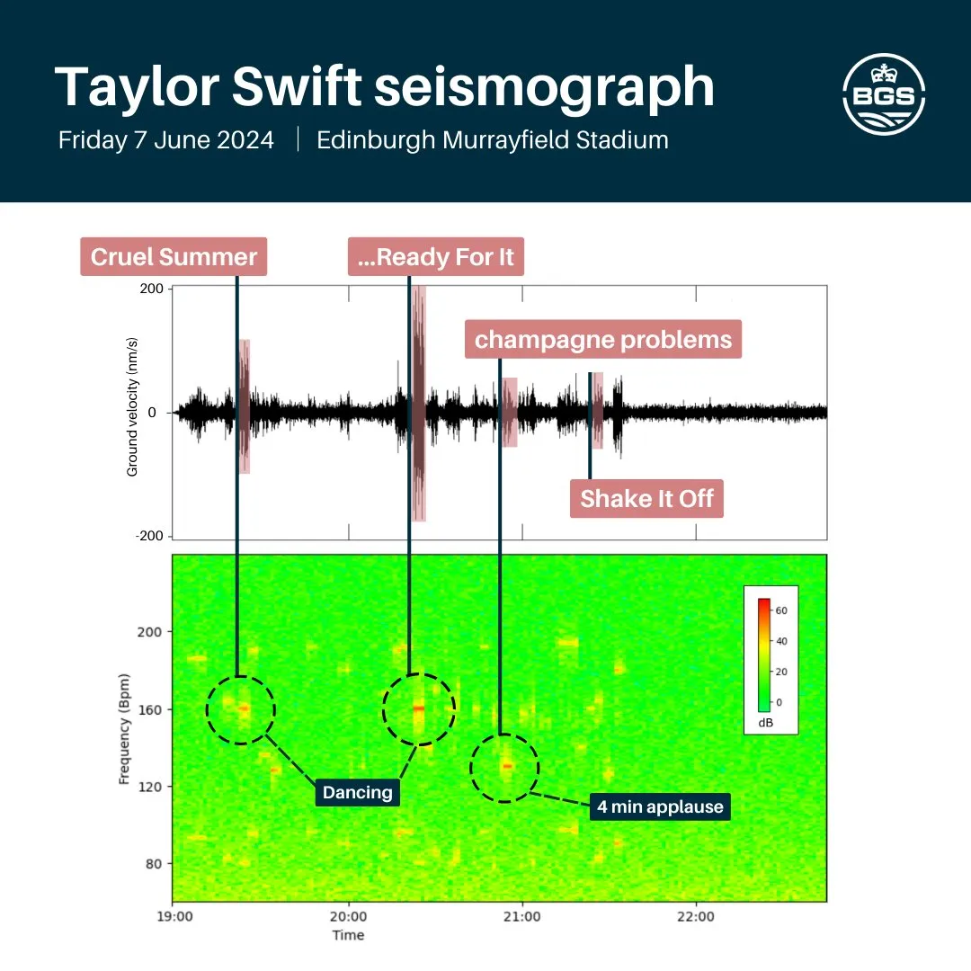 Taylor Swift's fans in Edinburgh danced so hard it was registered as seismic activity. According to the analysis of seismograph data of the British Geological Survey (BGS), the national earthquake monitoring agency of the United Kingdom; Taylor Swift's record-breaking concerts in Edinburgh are now scientifically recognized as "ground shaking", with earthquake measurements detected up to 6km from the venue.
