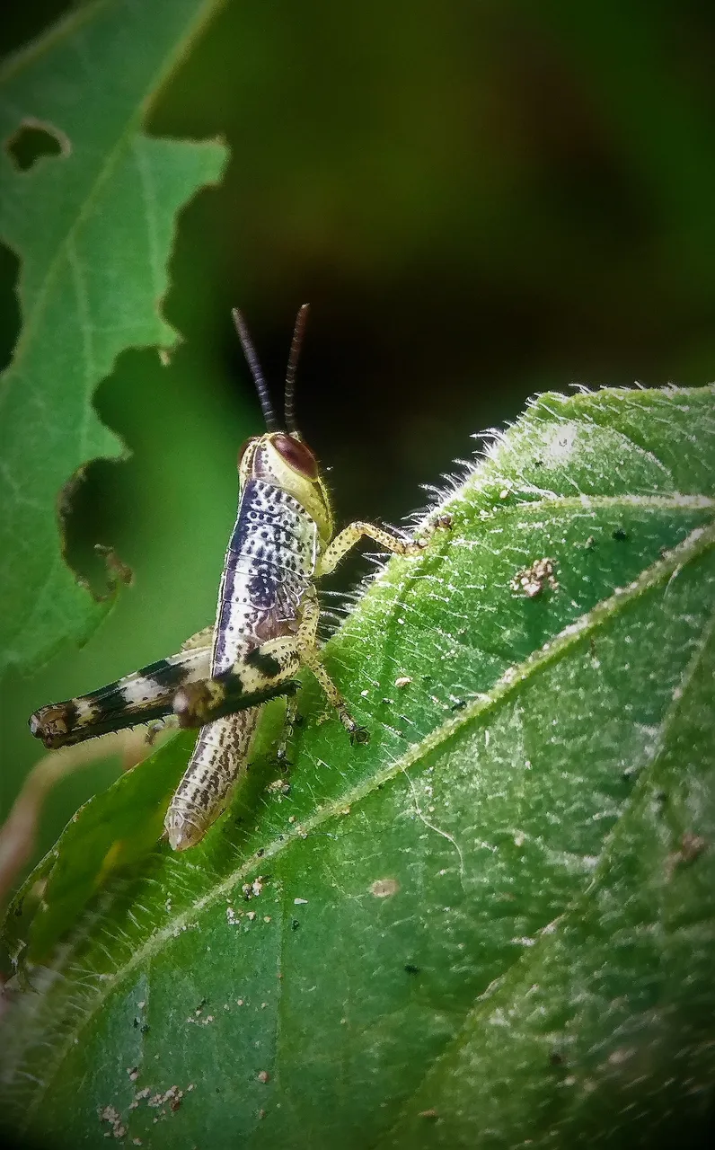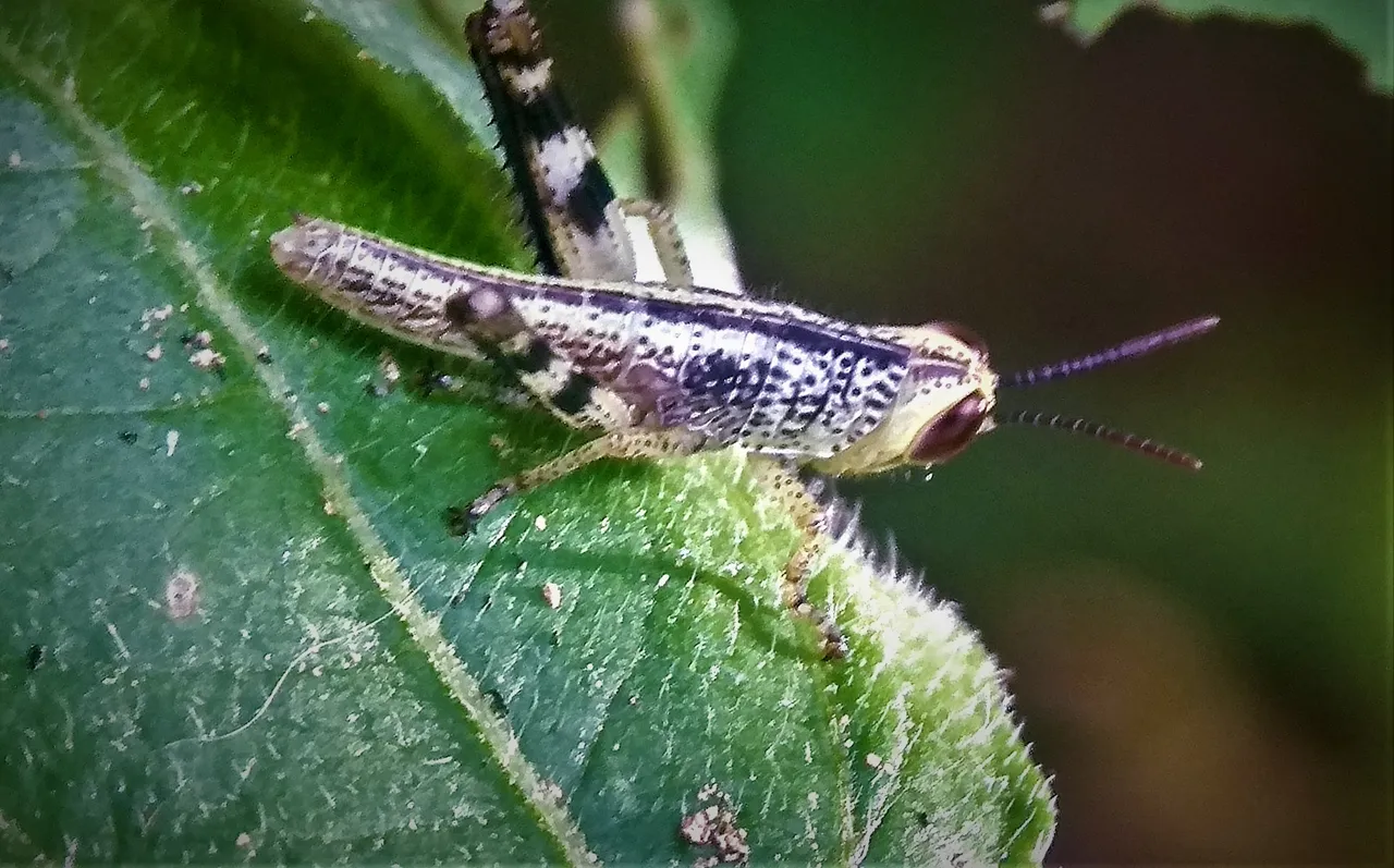 While black has small black spots on the body. But this grasshopper has a body shape that is almost the same as a wooden grasshopper. maybe as an adult will experience a change in colour.