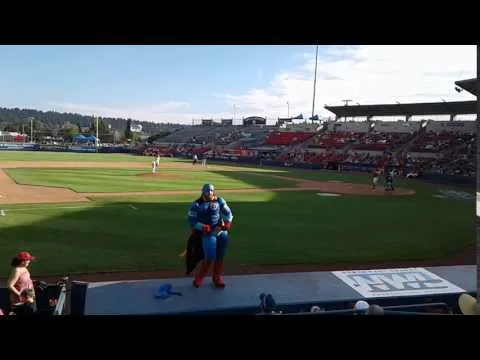 Today's game also featured the debut of a new mascot, a yet-unnamed Redband Trout representing Spokane, Avista Utilities, and other organizations seeking to reverse the population decline of river trout. This mascot stood in the left field corner of the stadium and occasionally ran into the outfield, but avoided the stands and crowd.